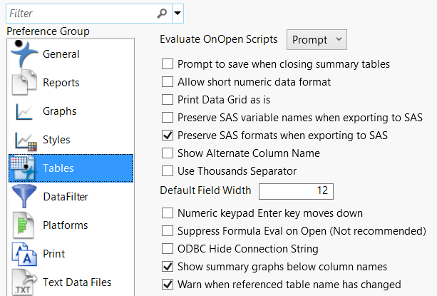 Table preferences customize JMP data tables, including formula handling, appearance, and compatibility with SAS data sets.