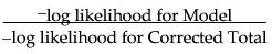 The Likelihood Ratio Chi-square test statistic is computed as twice the negative log-likelihood for Model in the Tests table. Some books use the notation G2 for this statistic. The difference of two negative log-likelihoods, one with whole-population response probabilities and one with each-population response rates, is written as follows: