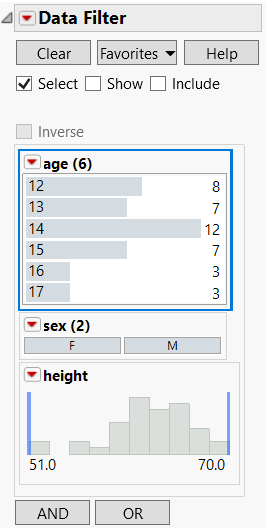 You can see that all of the rows containing males are highlighted in the data table and in the histograms. Now you decide that you want to see only the students who are age 12.