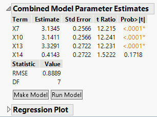 The Fit Group Orthogonal Supersaturated Report has two sections. The first section reports the estimates of active effects within each group, fitting one group at a time. Only active groups are shown. This is Stage 1 of the analysis. In Stage 2 a combined model is constructed