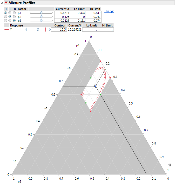 The Fit Model report also has a Mixture Profiler that is useful for visualizing and optimizing response surfaces from mixture experiments. Many of the features are the same as those of the Contour Profiler. However, some are unique to the Mixture Profiler: