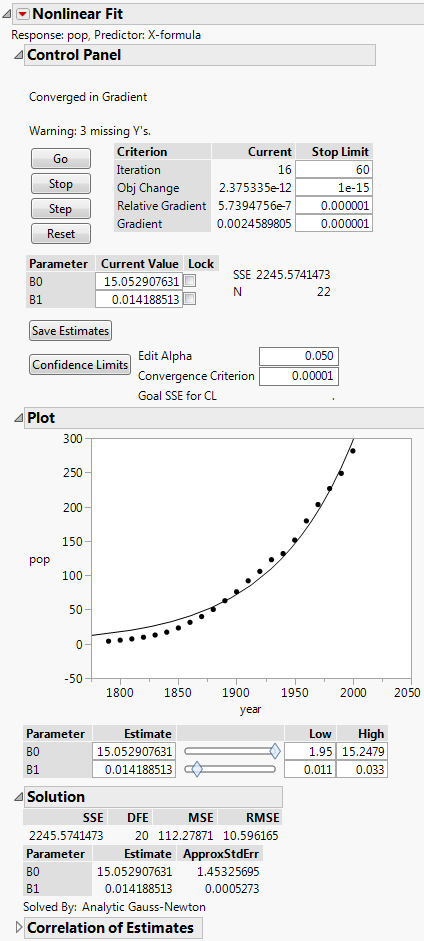 Lists the parameter estimates produced. Keep in mind that with nonlinear regression, there might be problems with this estimate even if everything seems to work.