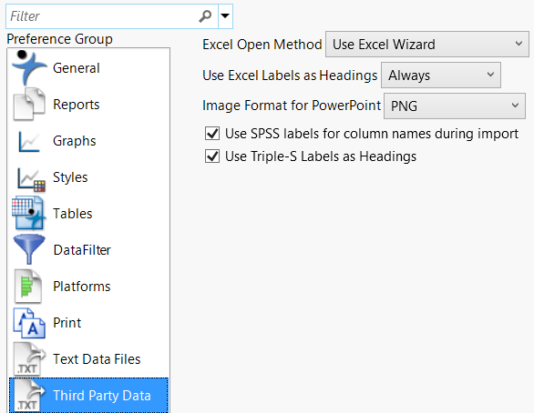 These preferences specify settings for third-party data, such as Microsoft Excel and SPSS files.
