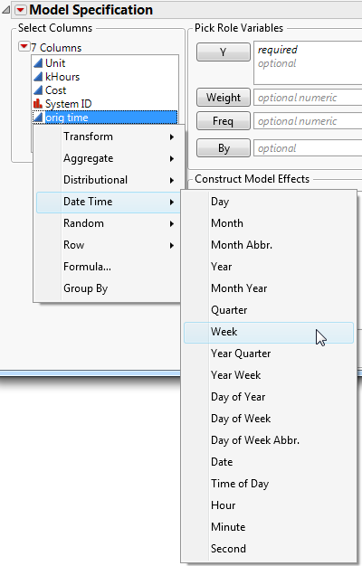 Each column listed in the Select Columns pane of the launch window includes an icon representing the column’s modeling type (continuous, ordinal, or nominal) and the column name. Right-click a column name to create a transform column using Transform, Character, Combine, Pairwise, Aggregate, Distributional, Date Time, Random, Row, Vector, or Formula to calculate the column’s values.