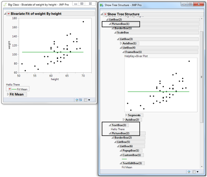 You can use the Sib Append message to add a display box immediately after an existing display box. Figure 11.23 shows two picture box trees. Picture Box( 1 ) holds the Bivariate scatterplot. Picture Box( 2 ) holds the Fit Mean menu, determined by seeing the green line and the Fit Mean text box.