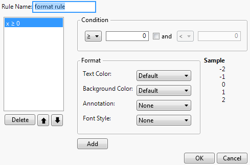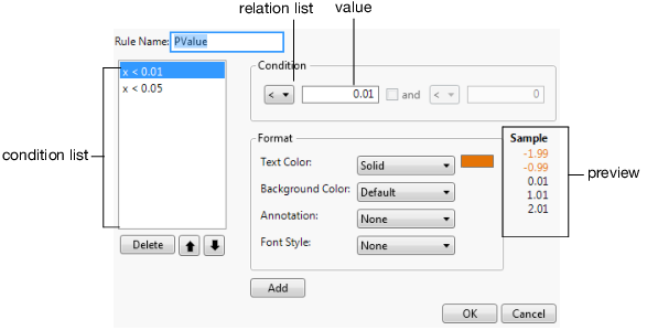 Tip: When you click Add, the condition and its format settings are immediately added to the bottom of the condition list and the Condition and Format areas return to their default settings. Verify your settings before you click Add.