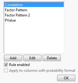 By default, JMP includes conditional formatting for Correlation, Factor Patterns, and PValue. These rules are enabled by default. The PValue rule is applied to columns that contain probability values.