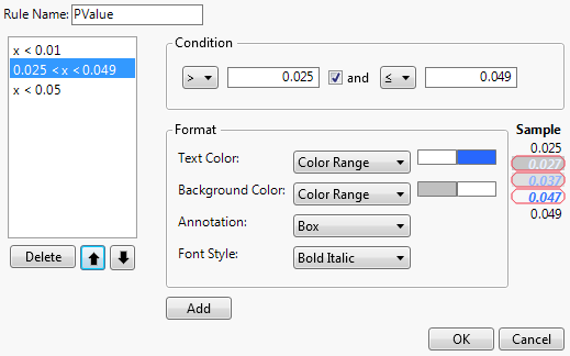The default rule for PValue includes two conditions. The order of the list indicates the order that the rules are applied. For example, a p-value of 0.04 would not invoke the first rule (x < 0.01) but would invoke the second rule (x < 0.05).