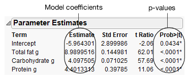 In this example, the p-values are all very small (<.0001). This indicates that all three effects (fat, carbohydrate, and protein) contribute significantly when predicting calories.
