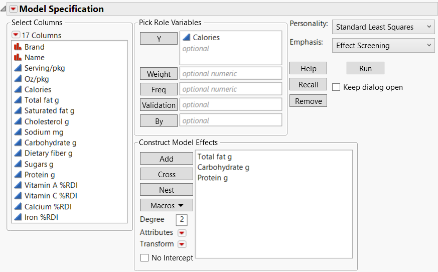 4. Select Total fat g, Carbohydrate g, and Protein g, and click X.