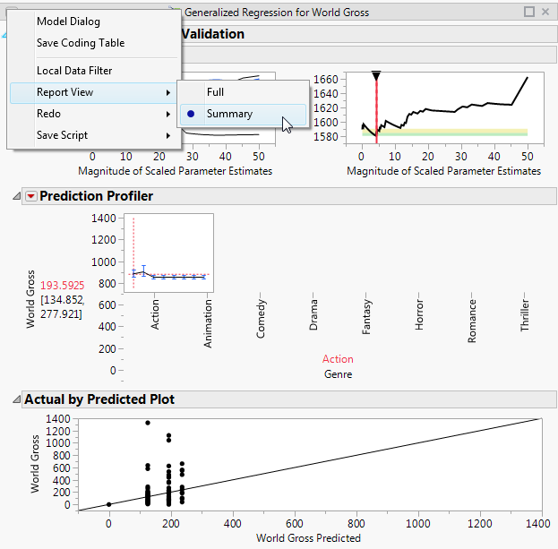 A report that contains graphs and statistics can grow fairly large. To view only the graphs while running the report, select the top red triangle in a report and then select Report View > Summary. The report shown in Figure 11.8 originally showed parameter estimates. In the Summary view, only the graphs are shown.