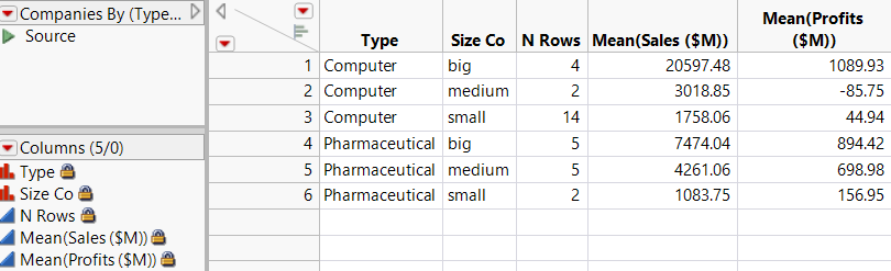 • The N Rows column shows the number of rows from the original table that correspond to each combination of grouping variables. For example, the original data table contains 14 rows corresponding to small computer companies.