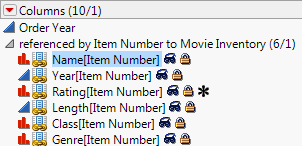 The Columns panel in a data table shows you the names of the linked columns. For example, open the Movie Inventory.jmp and Movie Rentals.jmp sample data tables to see the linked columns shown in Figure 9.12.