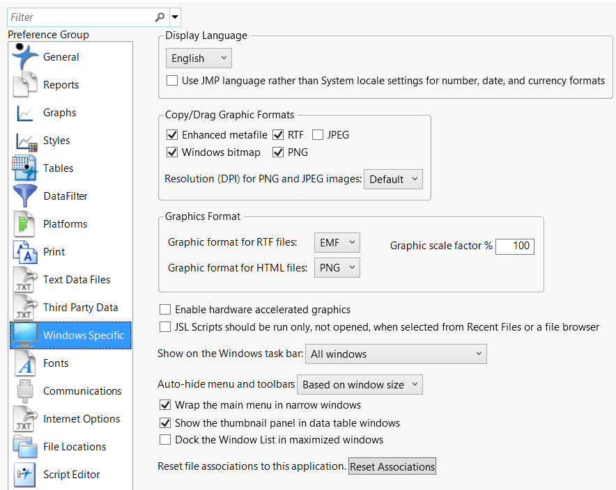 Reset file associations to this application | Click this button to associate all JMP file types with the JMP version that you are running. |