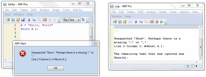 Syntax and compatibility errors are reported in the log, including the line number and code that JMP could not process (Figure 4.9).