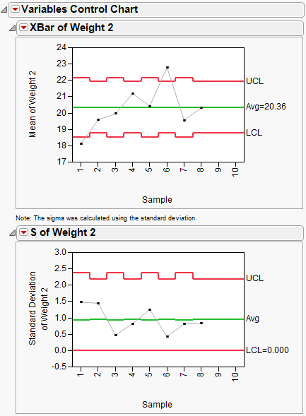 Weight 2 has several missing values in the data, so you might notice the chart has uneven limits. Although, each sample has the same number of observations, samples 1, 3, 5, and 7 each have a missing value.