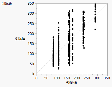 对于连续响应,“预测值-实际值”图是实际响应对预测响应的典型图。拟合决策树时,叶中的所有观测具有相同的预测值。若有 n 个叶子,则“预测值-实际值”图最多显示 n 个非重复的预测值。实际值形成围绕 n 个垂直线上每个叶均值的散布点。