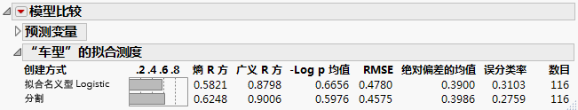 该报表显示“分割”模型的“熵 R 方”和“广义 R 方”的值略高,而“误分类率”的值略低。