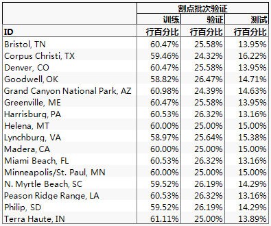 “生成验证列”平台的更多示例本例使用一年内从美国的 16 个气象站收集的每周气象数据。运行数据表中的“气象站位置”脚本来查看位置图。并非每个气象站都提供一年中每周的周温度测量值。您关注的是根据数据收集的日期为该数据表创建验证列。对于每个气象站,您希望使用前 60% 的观测进行训练,使用接下来 25% 的观测进行验证,使用最后 15% 的观测进行测试。本例演示在此类情形中使用“批次 ID”列的重要性。
