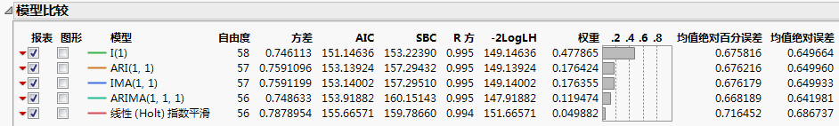根据 AIC 准则,“模型比较”表按以下方式排序:最佳拟合模型位于列表顶部。在本例中,ARIMA(0,1,0) 模型(在报表中表示为 I(1))拟合原始时间序列的效果最好。还应注意,尽管 I(1) 模型是“最佳的”,所有模型的拟合统计量值都非常相近。它们都可以被视为合适的模型。