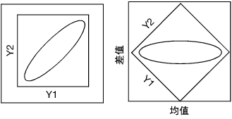 Figure 19.7显示两个响应的正相关如何成为差值(垂直轴)上的小方差。若为负相关,则椭圆将在另一个方向上延伸,并且旋转图形的方差在垂直轴上较大。