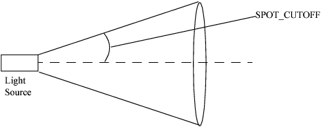 To create a spotlight, limit the shape of the light to a cone. Use the SPOT_CUTOFF argument to define the side of the cone, as shown in the following illustration.