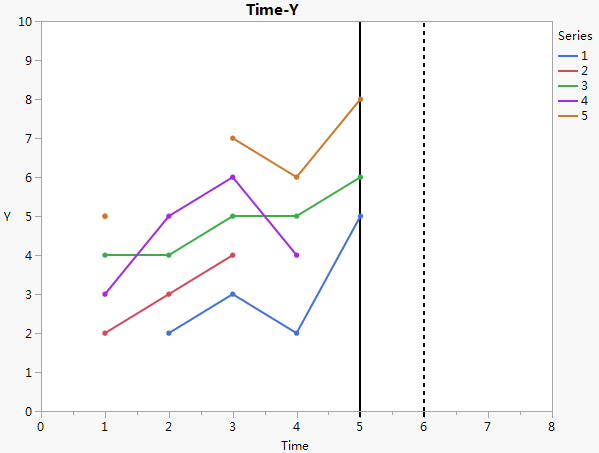 • 所有时间序列都收集到同一最终观测时间点。这个最终观测时间点被定义为发生在任何单个时间序列中的最近时间点。到最终观测时间点没有数据的序列被认定包含缺失值。例如,在Figure 18.5 中,最终观测时间点为 5,用黑色实线表示。可以认定:序列 2 在时间点 4 和 5 处缺失观测,序列 4 在时间点 5 处缺失观测。