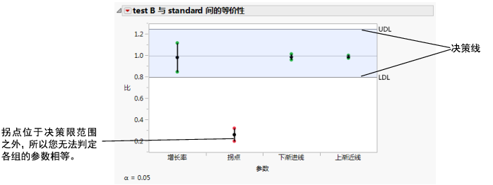 参数是否相等通过分析参数的比值来检验。默认决策线放置在比值 0.8 和 1.25 的位置上,这表示 25% 的差异。