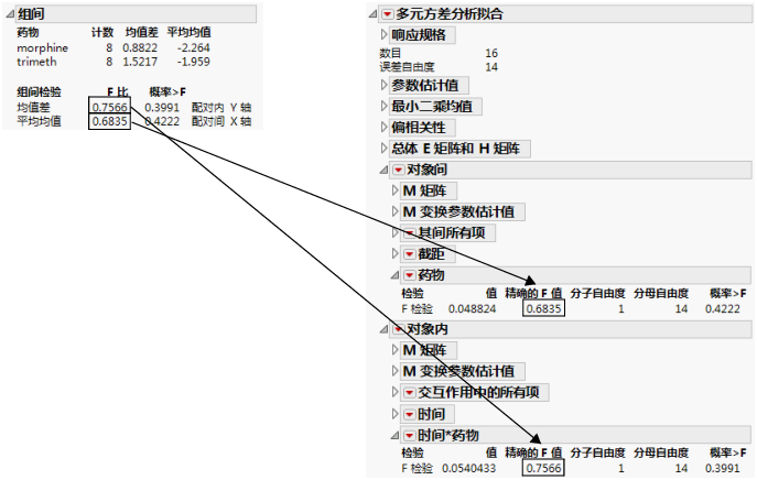 “组间”报表中的“均值差”的“F 比”对应于“对象内”报表下的“时间*药物”的“F 比”。“组间”报表中的“平均均值”的“F 比”对应于“多元方差分析拟合”报表中的“对象间”下的药物的“F 比”。