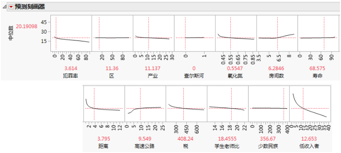 有些变量的刻画迹线具有正斜率,有些则具有负斜率。例如,变量房间数具有正斜率。这表明住房中的房间数越多,中位数预测值就越高。变量 pt 是按城镇划分的师生比。该变量的斜率为负数,指示师生比越高,中位数值越小。