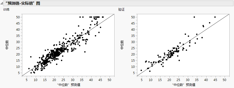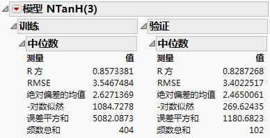 验证集的 R 方统计量为 0.913,表明该模型可以很好地预测未用于训练模型的数据。作为对模型拟合的进一步评估,点击“模型 NTanH(3)”旁边的红色小三角并选择标绘“预测值-实际值”图。