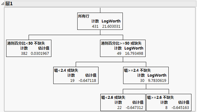 “树视图”报表随即显示,并且为各层都显示概要图。您可以检查各层以查看拟合的树和预测值。