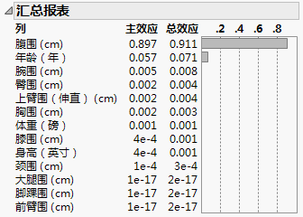 “汇总报表”显示腹围 (cm) 是体脂肪百分比最重要的预测变量。
