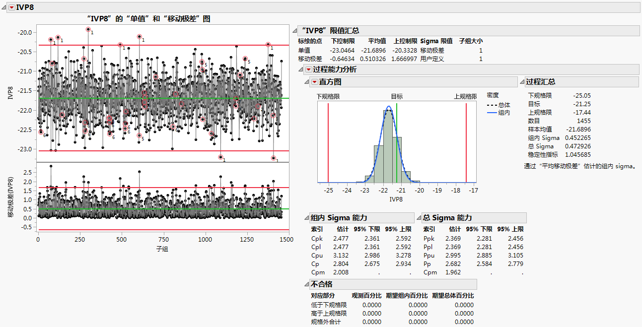 将显示“控制图生成器”报表。因为 IVP8 有“规格限”列属性,该报表还包含能力分析。