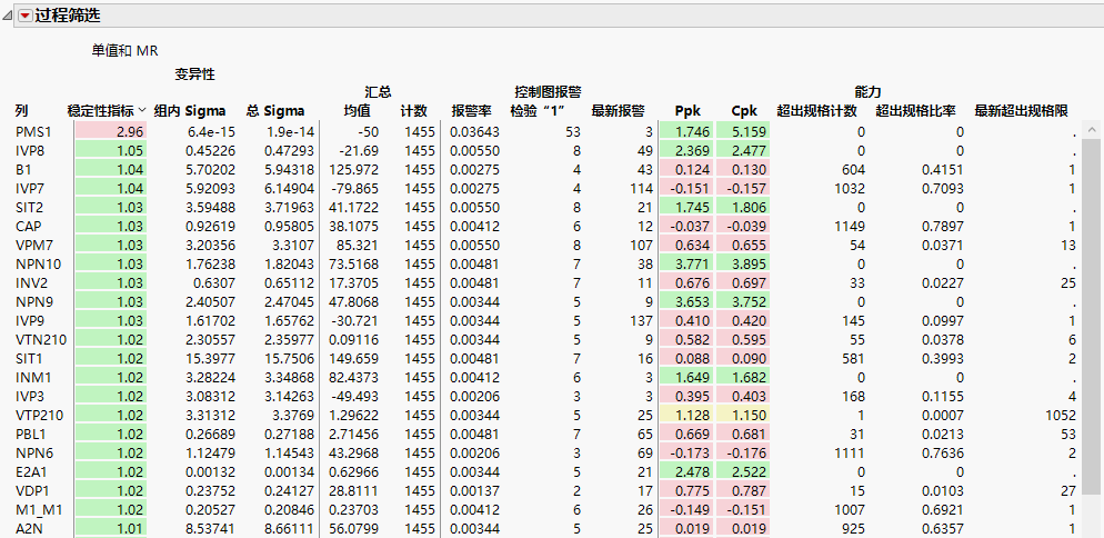 “过程筛选”窗口出现时,显示每个过程的结果表。该表按“稳定性指标”排序。这是过程的稳定性测度,其中稳定过程的稳定性指标接近 1。稳定性指标值越高表示过程越不稳定。(该排序由报表中“稳定性指标”旁边的插入符号表示。)您想更仔细查看稳定性指标值大于等于 1.03 的过程。