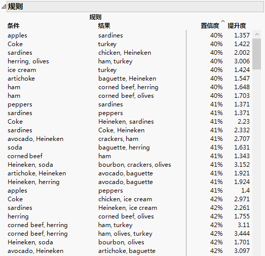“频繁项集”表按项集的字母顺序排序。在列表中滚动浏览,直到看到条件项集 {chicken, ice cream} 的支持度为 14%。结果项集 {Coke, sardines} 的支持度为 15%。该关联规则有较高的提升值,但和您查看的第一个关联规则比,其表示的交易要少的多。