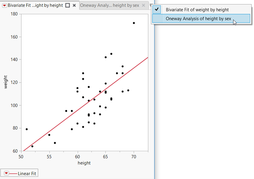 Tab Page Box( Title( "Oneway Analysis of height by sex" ),dt << Oneway( // Oneway report