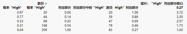 Figure 4.19 提供一个值表来演示如何计算用于Figure 4.18中所示的“High”提升曲线的“提升”和“对应部分”。构建了具有五个拆分的一个分割模型来预测响应 Y 二值型。Y 二值型具有两个水平:“Low”和“High”。提升曲线基于 309 个观测。有 83 个观测到的“High”响应,总体比率为 0.27。