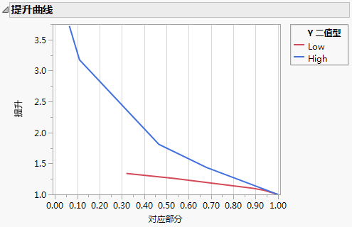 注意:对于较小的模型,可能有大部分点都具有相同的预测概率值。若该概率是响应水平的最高预测概率,则提升曲线不会从“对应部分 = 0”开始。例如,Figure 4.18 的“Low”提升曲线中对此进行了演示。