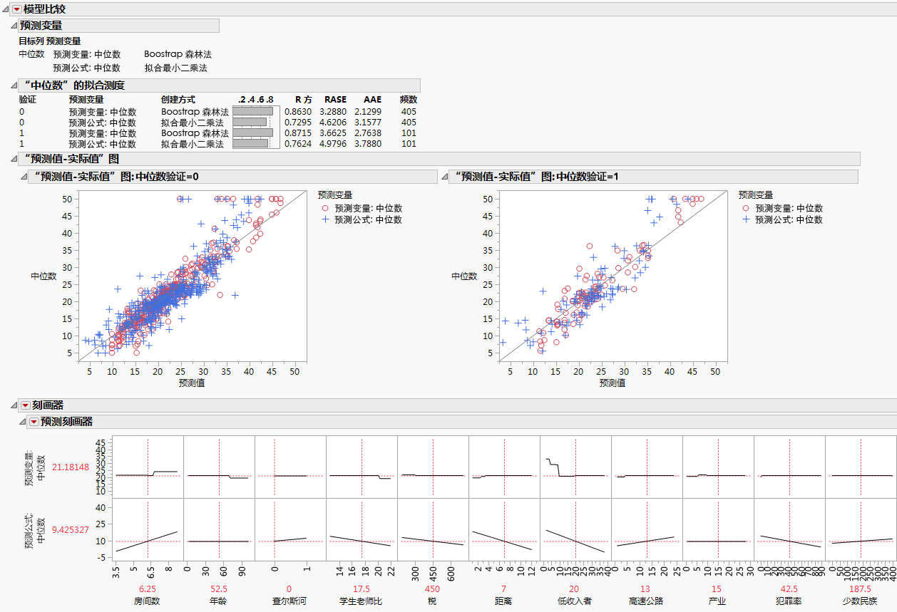 JMP Pro 中的“模型比较”平台支持您比较不同模型的预测能力。为每个模型都提供了拟合测度以及叠加诊断图。