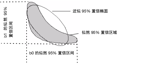 • 渐近标准误差生成的置信区间使用椭圆近似该区域并在极值处(在水平和垂直的切线处)取参数值。