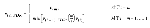 针对假发现率调整的 p 值(表示为 p(i), FDR),按以下方式计算: