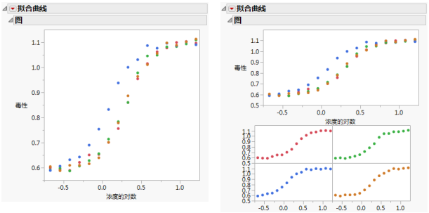 “拟合曲线”报表最初仅包含 X-Y 图。若您指定“分组”变量,该报表则包含每一组拟合模型的叠加图和单个图。