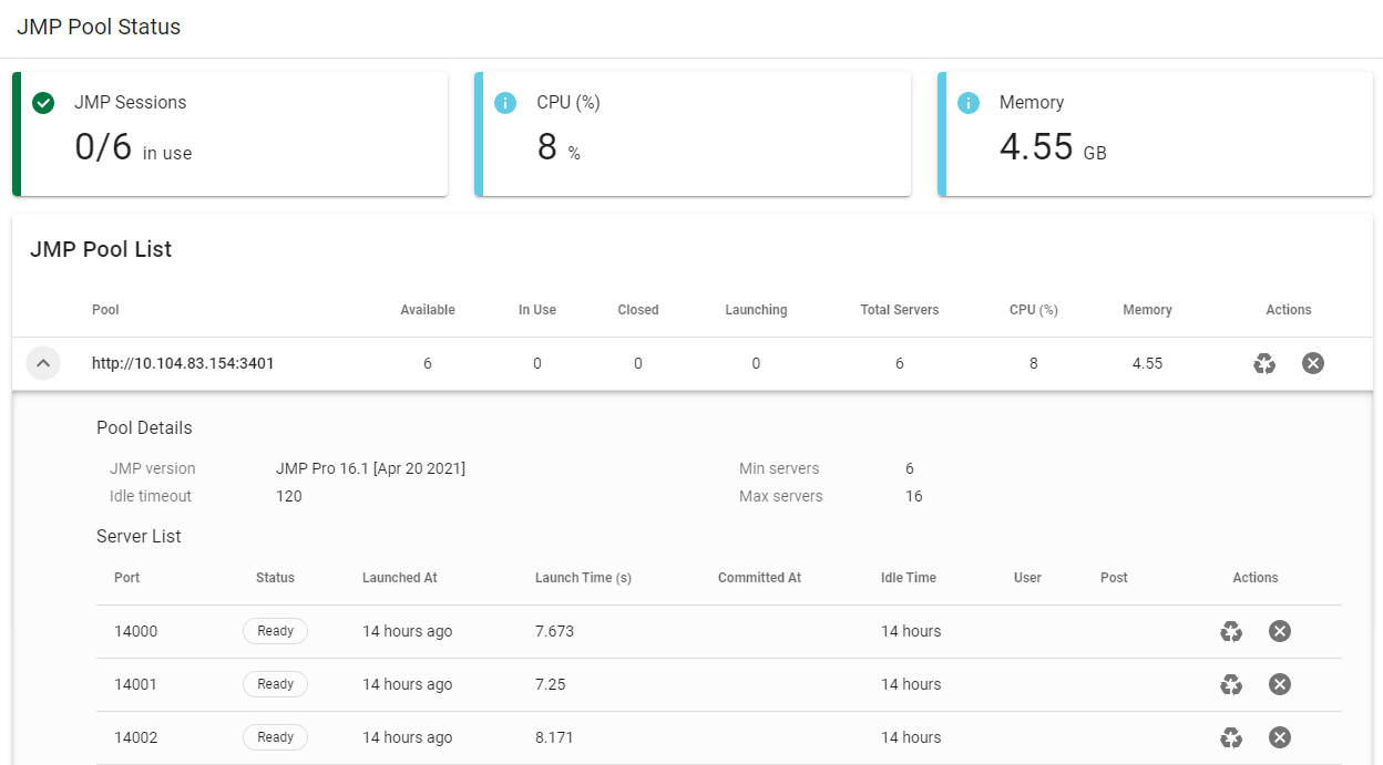 The Summary at the top shows you how many JMP sessions are currently in use. You also see CPU and memory statistics indicating how busy the sessions are.