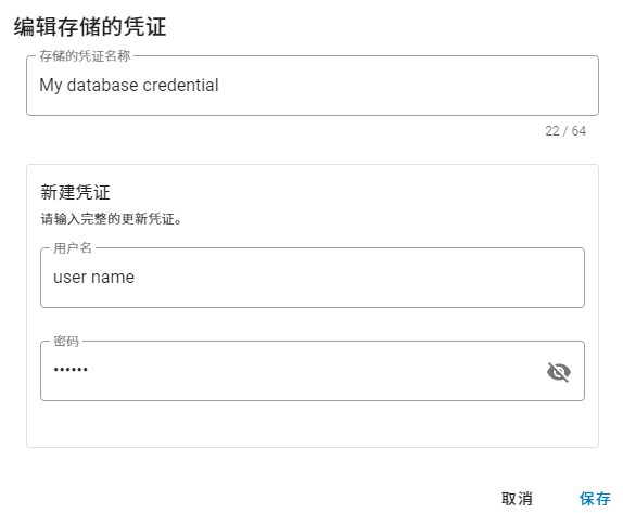 为凭证添加标识名称,并且为数据库添加用户 ID 和密码。详细信息,请参见分配凭证。