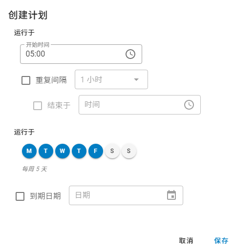 在“运行于”下,点击您不想刷新运行的那几天。在该示例中,S 和 S(星期六和星期日)被取消选择。