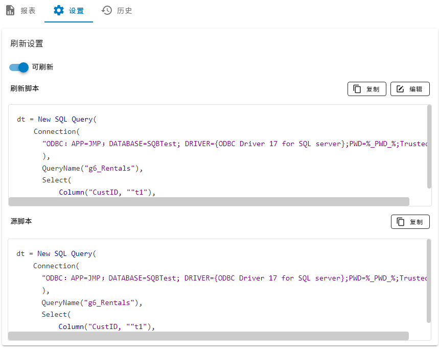 生成的数据表包含“源”脚本,它不用运行“查询生成器”即可再次获取数据。“源”脚本可用于创建刷新脚本。