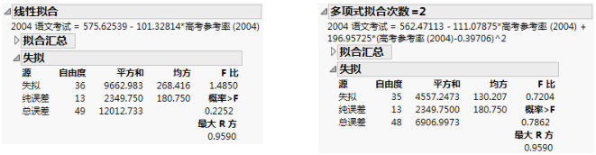 图 5.11 线性拟合和多项式拟合的“失拟”报表的示例