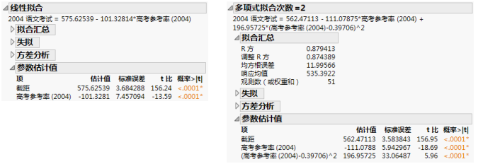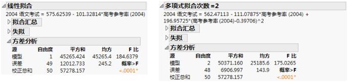 图 5.12 线性拟合和多项式拟合的“方差分析”报表的示例
