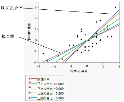 图 5.21中的散点图显示标准化的身高和体重值,并通过多个线条拟合来演示所选的不同正交方差比的行为。在认为 X 变量的方差非常小时,将呈现标准线性回归(拟合线)。当 Y 变量的变异可忽略时,以 X 拟合 Y 是另一个极端。所有其他线条都落在这两个极端之间,并随方差比的变动而偏移。随着方差比增大,Y 响应中的变异占主导地位,拟合线的偏斜程度更靠近以 X 拟合 Y。同样,当您减小方差比时,拟合线的偏斜程度更靠近以 Y 拟合 X。